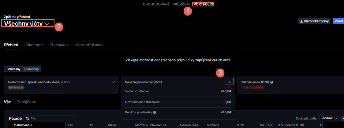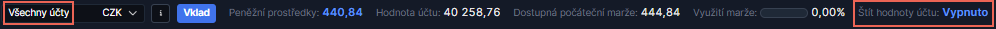 - Rezervovaná počáteční marže: Pokud držíte maržové pozice (např. CFD/FX), rezervovaná počáteční marže je blokována z vašich peněžních prostředků.