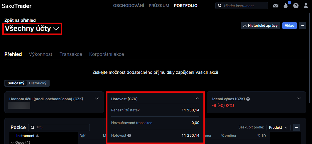 "Hotovost" můžete najít pod sekcí Portfolio a kliknutím na relevantní podúčet, nebo všechny účty dohromady: