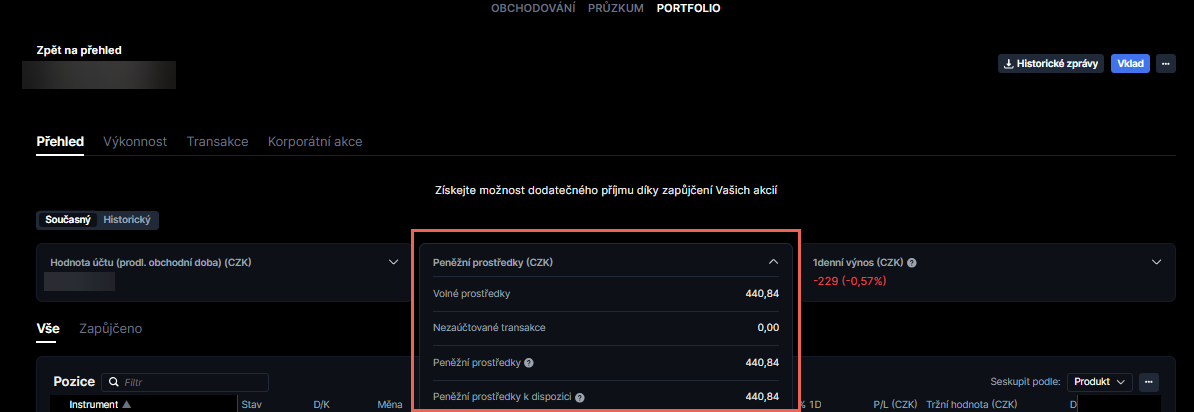 "Peněžní prostředky" můžete najít pod sekcí Portfolio a kliknutím na relevantní podúčet, nebo všechny účty dohromady: