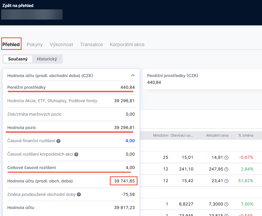 "Peněžní prostředky" spolu s "Hodnotou Vašich pozic" a "Časovým rozlišením" tvoří "Hodnotu účtu".