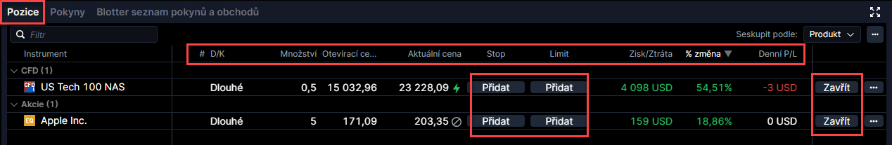 Zde také uvidíte všechny relevantní informace pro každou pozici včetně množství, otevírací a aktuální zavírací ceny a pozici P/L.