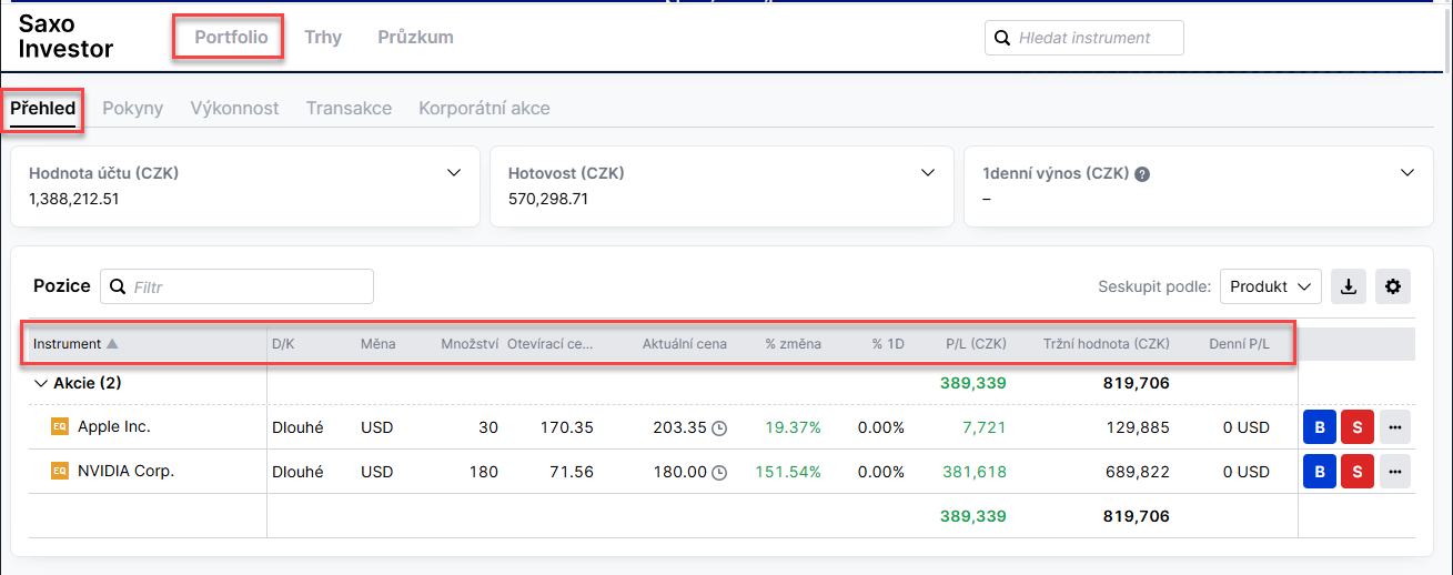 V SaxoInvestor najdete své pozice pod záložkou Portfolio , kde uvidíte rozdělení vašich pozic podle instrumentu.