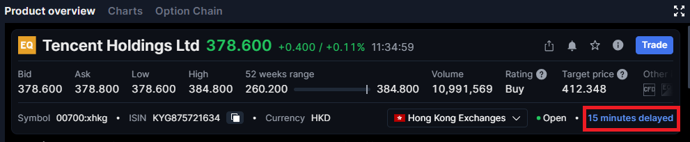 U produktů, jako jsou akcie, futures nebo opce, jsou standardně zobrazované ceny zpožděné. Obvykle se jedná o zpoždění 10–15 minut.