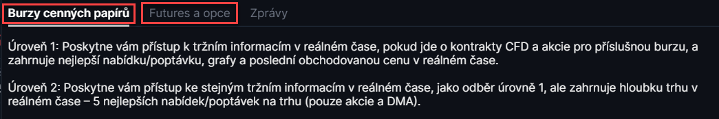 Pod daným produktem uvidíte označení „15 minut zpoždění“ (akcie a akciové opce) nebo „10 minut zpoždění“ (futures).