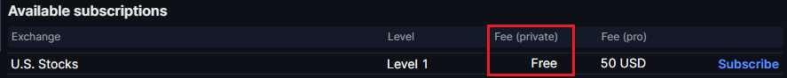 Při přihlášení k odběru dat v reálném čase pro US akcie úrovně 1 je nutné zvolit, zda jste neprofesionální nebo profesionální uživatel. Jako neprofesionální uživatel máte k těmto datům přístup zdarma, přičemž způsobilé akcie jsou označeny jako „Zdarma“, jak je znázorněno na níže uvedeném snímku.