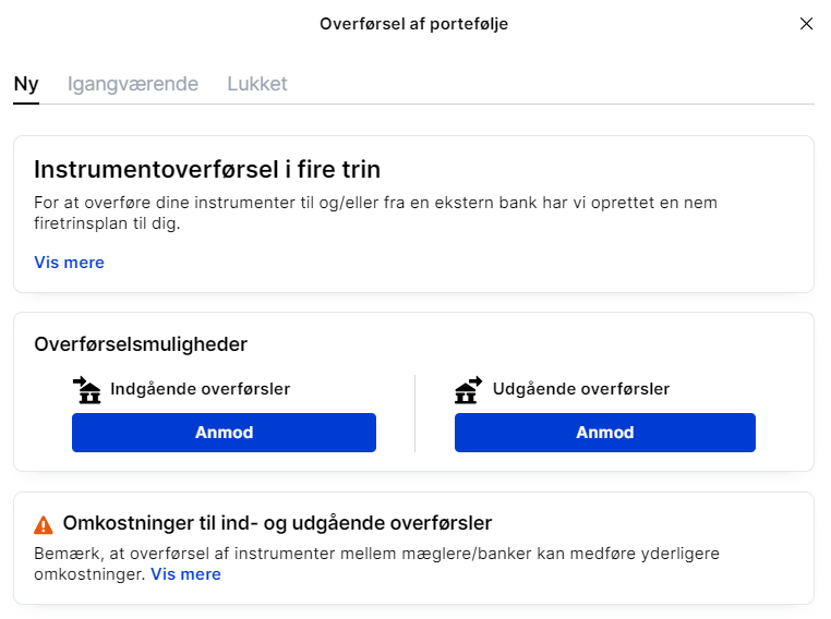Prøver du at finde ud af, hvordan du opretter en udgående overførselsanmodning? Så læs vores artikel Hvordan overfører jeg værdipapirer fra min Saxo-konto?. |