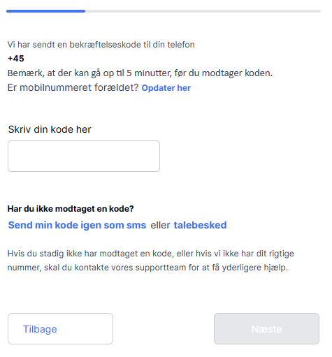 Du modtager herefter en bekræftelseskode på SMS eller talebesked (det kan tage op til 5 minutter)