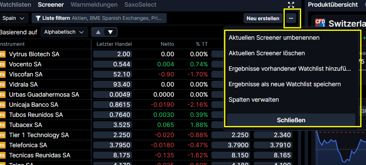 Der Produktscreener kann verwendet werden, um dynamische Watchlists zu erstellen, basierend auf Auswahlkriterien wie Land, Börsen, Marktkapitalisierungen (USD), Analystenkonsens, Listing, Kurs/Gewinn-Verhältnis und Währungen.