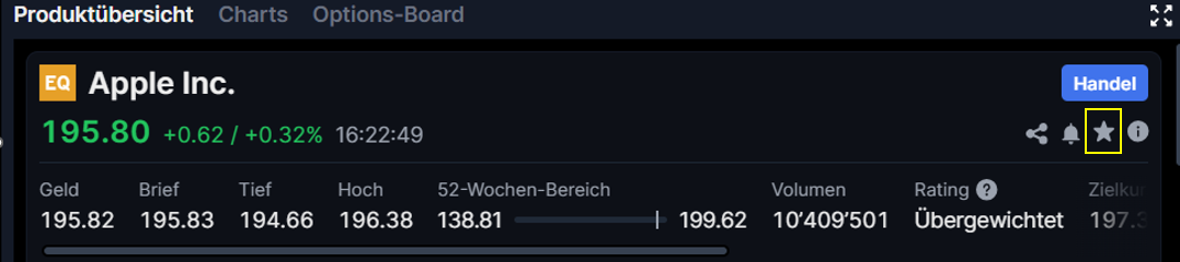 Suchen Sie Instrumente oder klicken Sie auf den Stern unter der Produktübersicht, um das gewünschte Instrument in Ihre Watchliste hinzuzufügen:
