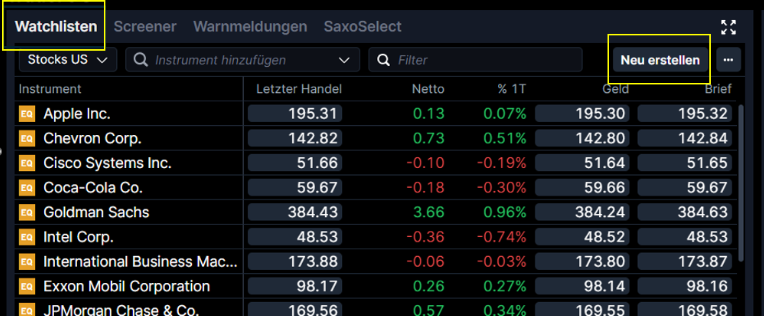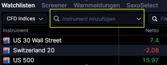 Erstellen Sie Ihre Watchliste auf SaxoTrader (click here for SaxoInvestor)