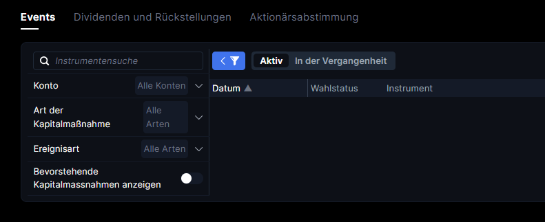 Auf unseren Plattformen finden Sie Ihre Kapitalmassnahmen, indem Sie zum Hauptmenü > Unternehmensmassnahmen > Events > Aktiv bzw. In der Vergangenheit