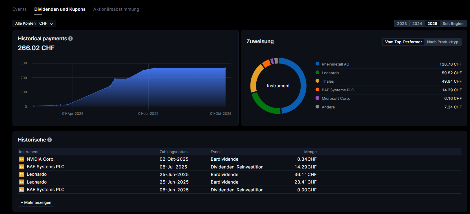 Das Dashboard (Übersicht) für Dividenden und Kupons bietet eine konsolidierte Übersicht über Ihre Erträge aus Kapitalmassnahmen, einschliesslich sowohl Dividenden als auch Kuponszahlungen von Anleihen.
