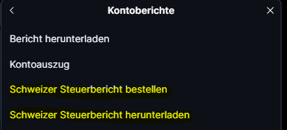 - Klicken Sie auf Mein Profil > Kontoaktivitäten und Berichte > Kontoberichte > Schweizer Steuerbericht bestellen