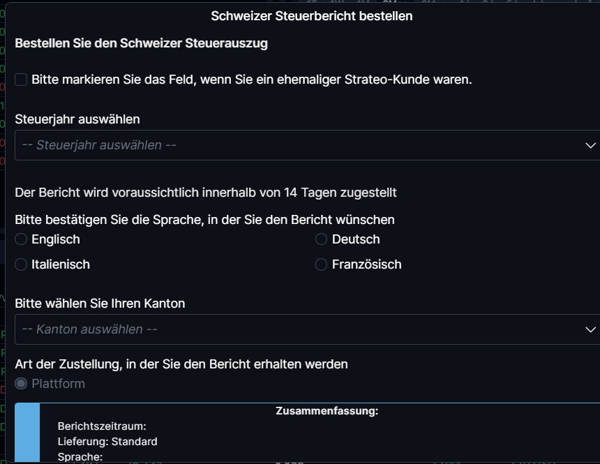 Der Schweizer Steuerauszug kann jederzeit online über unsere Plattform bestellt werden. Bitte beachten Sie, dass für die Erstellung des Steuerauszugs eine Gebühr anfallen kann. Nach der Bestellung wird der Steuerauszug direkt über die Plattform bereitgestellt, sodass Sie ihn jederzeit abrufen können. Sie erhalten von uns eine entsprechende Email zugestellt. Weitere Informationen finden Sie hier.