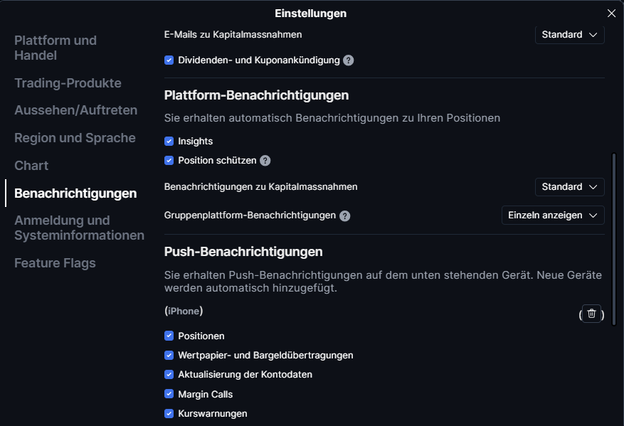- Im Abschnitt „Push-Benachrichtigungen“ können Sie Benachrichtigungen für jedes Mobilgerät verwalten, auf dem SaxoTrader installiert ist (Telefon und Tablet).