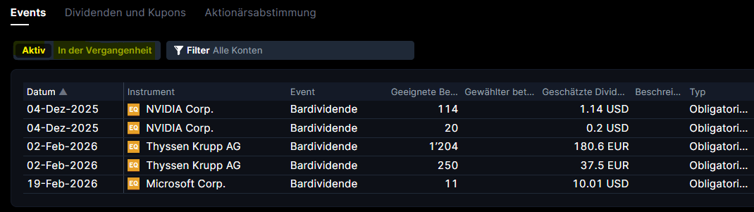 Obligatorische Unternehmensereignisse werden angezeigt, sobald sie bestätigt sind, vom Ex-Datum bis zum Zahlungstermin. Sobald der Zahlungstermin erreicht ist, werden die Ereignisse zu vergangenen Ereignissen verschoben, damit die Inhaber weiterhin Details einsehen können.