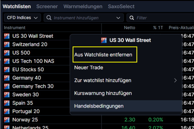 Instrumente in die Watchliste hinzufügen oder entfernen