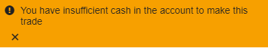 - Der verfügbare Bargeldsaldo auf Ihrem Konto ist zu niedrig. Bitte zahlen Sie entsprechend auf das Konto ein oder reduzieren Sie den Wert des Handels.