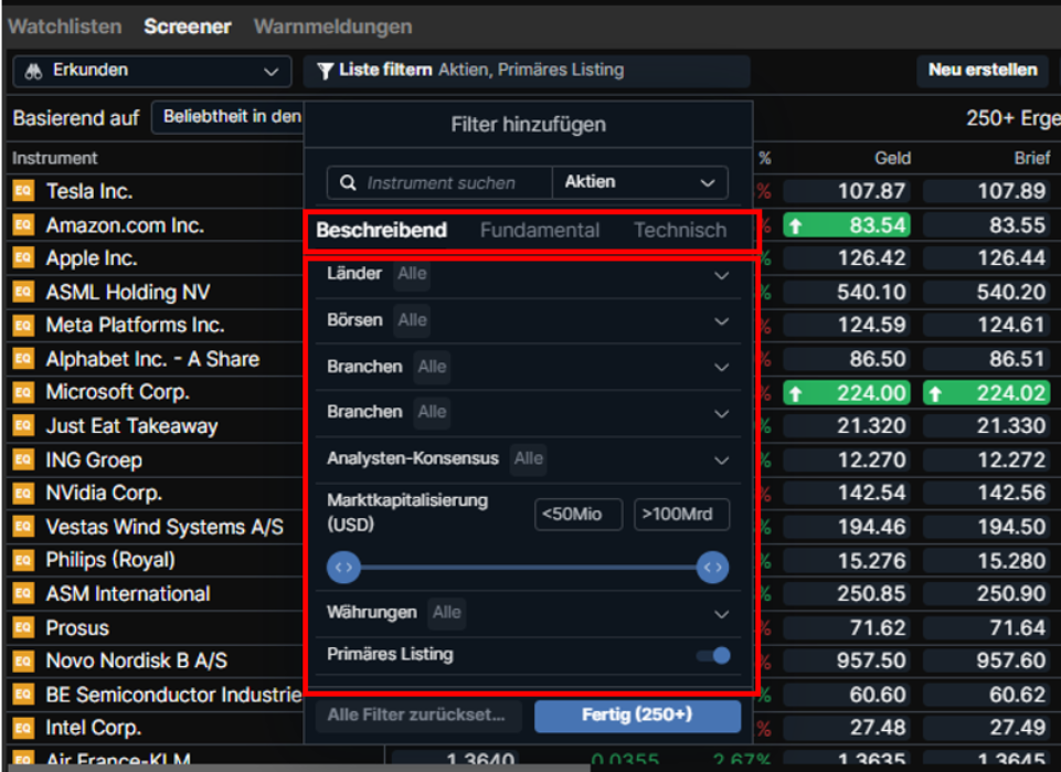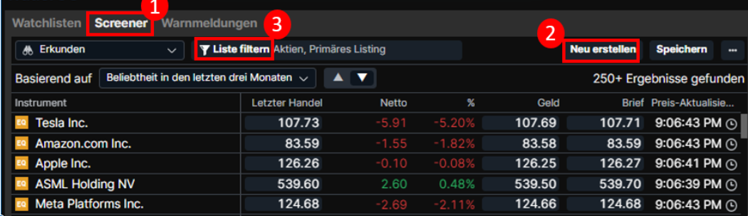 Um einen neuen Screener anzulegen gehen Sie auf Screener > Neu erstellen. Klicken Sie auf Liste filtern, um die gewünschten Filter hinzuzufügen: