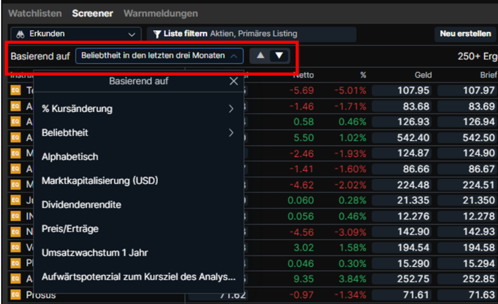 Die Ergebnisse können sortiert werden nach prozentualer Rendite, Beliebtheit, Marktkapitalisierung (USD), Dividendenrendite, Kurs/Gewinn-Verhältnis, Umsatzwachstum über 1 Jahr, Potenzial zum Analystenzielpreis und alphabetisch.
