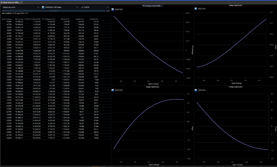 Example of an ORLConsider the ORL below. The underlying is Nasdaq 100 and the client holds several option contracts at different strikes. We can use the ORL to gain some quick insights as to the risk exposure of the client: