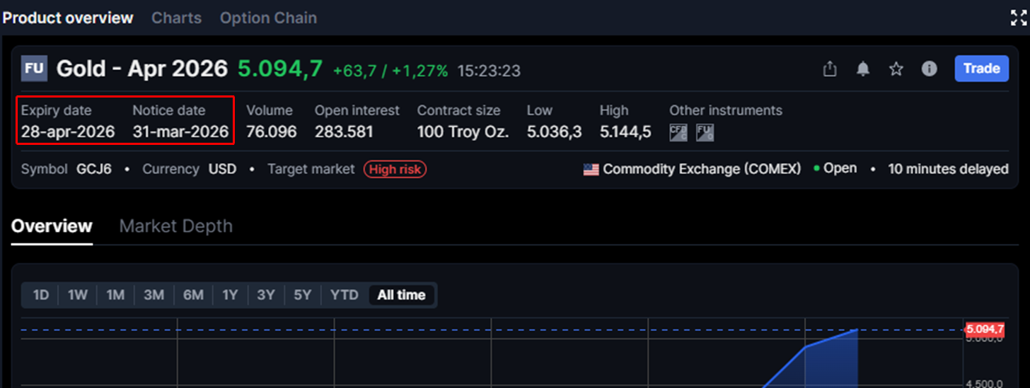 One of the main differences between trading future contracts and simpler products like stocks and ETFs is that a future contract has an expiration date, at which point the seller is obligated to sell and the buyer is obligated to buy at a predetermined price. When searching for an instrument, you can view the expiration month and year: