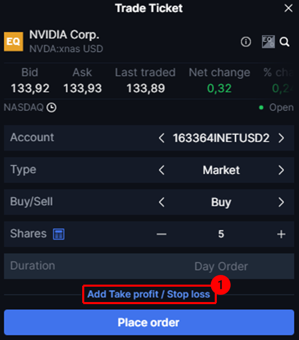 - In the Trade Ticket > Click Add Take Profit / Stop loss > Click on Stop Loss > Choose Stop Limit > Choose a Unit > Set your stop-limit and click Place Order
