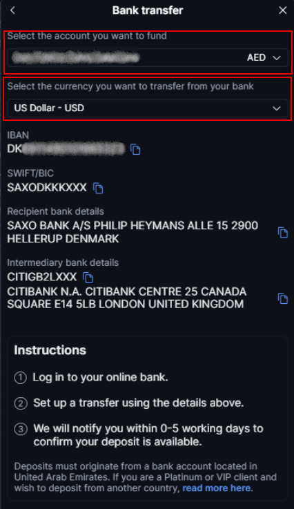 Where can I find my Saxo account's IBAN number? You can find your Saxo account's IBAN number in the platform in the Bank transfer module. |