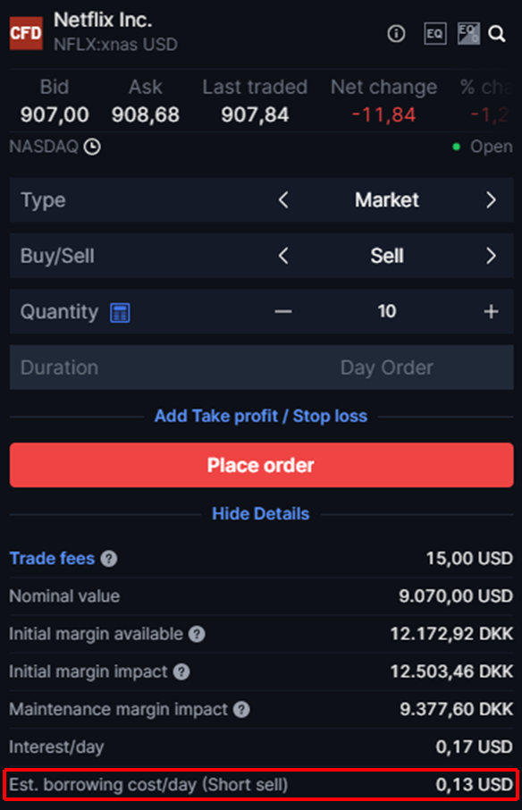 When selling a CFD, the borrowing cost for holding the position overnight is shown in the CFD Trade module in the Est. Borrowing cost/day (Short Sell) field. The borrowing rate will be fixed when the position is opened and will be charged on a monthly basis.