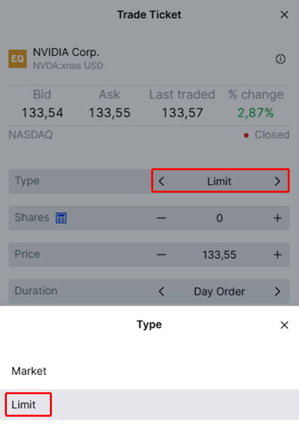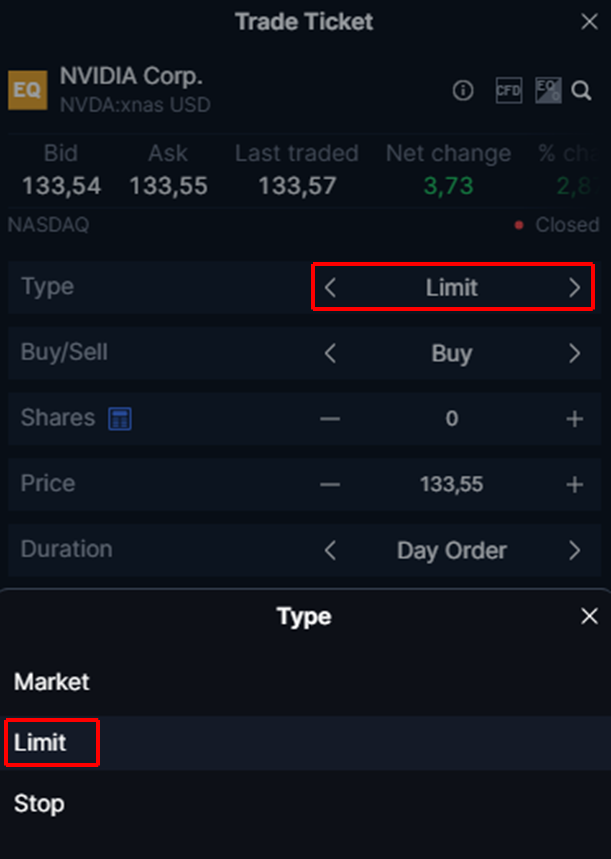Example of a limit orderImagine that the current market price of share XYZ is USD 280 per share. You want to buy 10 shares at a maximum price of USD 250 per share, so you place a limit order to buy at USD 250. You set the duration to one week, meaning that the order will remain active for one week from the time it is placed. If the order is not executed within that time frame, it will expire. Scenario 1: The price of the stock drops to USD 250. Your order is automatically executed and you buy 10 shares at USD 250. Scenario 2: The stock price remains above USD 250 for a week ahead. Since your order had a duration of a week, the order will expire.