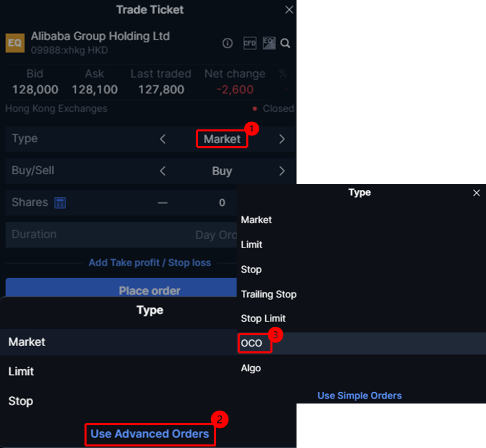 An OCO (one cancels the other) order is a type of advanced order that allows you to place two orders simultaneously. It is designed to automatically cancel one order when the other is executed, thereby helping you to manage risk and optimise your strategy.