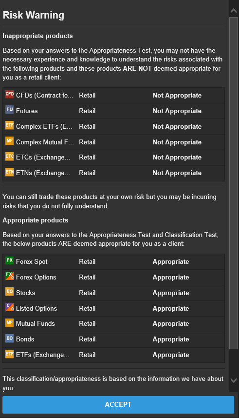 For example: If you are "Appropriate" for Forex Spot and you only trade Forex Spot, you can disable other products and will not see a risk warning on the next login. Please be aware, that if you disable other products, you will not see them on the trading platform.