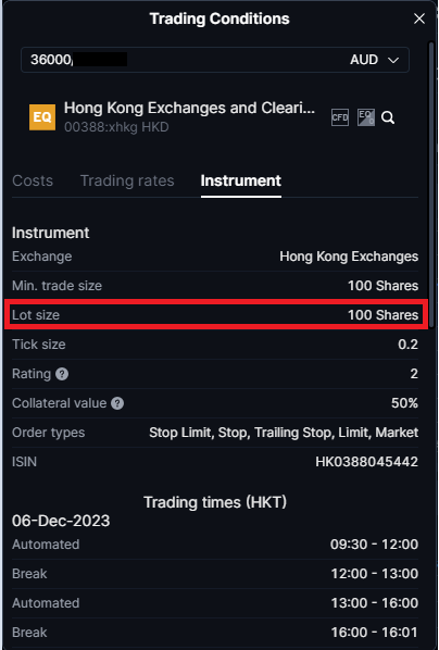 Where do I see the minimum trade amount, lot size, trading times etc. the trading conditions?
