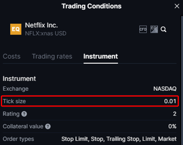 The tick size represents the minimum price movement of an instrument. Tick sizes are set by exchanges and can vary depending on the asset being traded. For example, a stock might have a tick size of USD 0.01, meaning its price can move in increments of one cent.