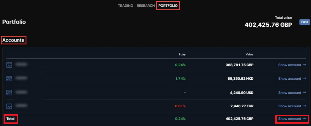 If you click Show account you will come to the overview section which provides you with a summary of your account, or accounts if you have more than one - then you need to click Show account at Total.