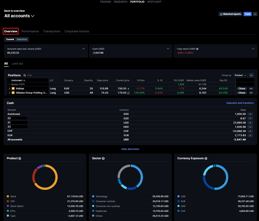 At the top, you will see your account value, cash and your 1-day return. Below, you can see your positions grouped by product, as well as a breakdown of your cash holdings. Finally, at the very bottom, allocation charts show what your portfolio consists of split into Product, Sector and Currency Exposure.