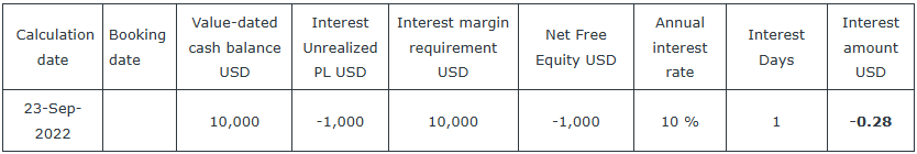 For Client B the interest loss on a given date is USD -0.28, calculated as: