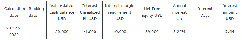 Interest on your main account is calculated on the Net Free Equity (NFE). Interest on sub-accounts is calculated on the Account Value. The interest is calculated daily and booked monthly.