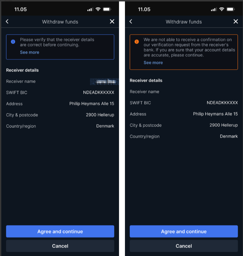- No match: If the receiving bank either identifies a different name on the account or fails to respond to our VoP name validation request, this doesn't necessarily indicate an issue with the account details. It simply means the receiving bank hasn't confirmed your ownership of the account to Saxo. Therefore, we will require your confirmation to proceed with the payout to the specified account.