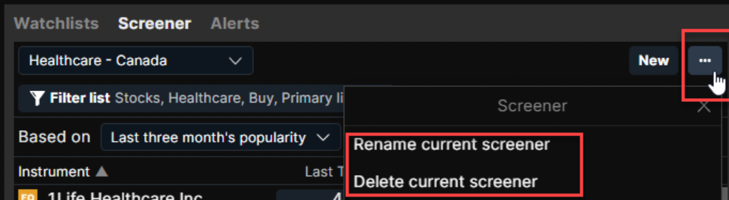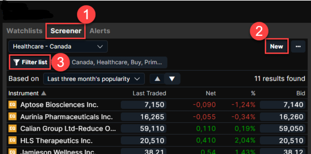 To add a new screening watchlist, select Screener > New