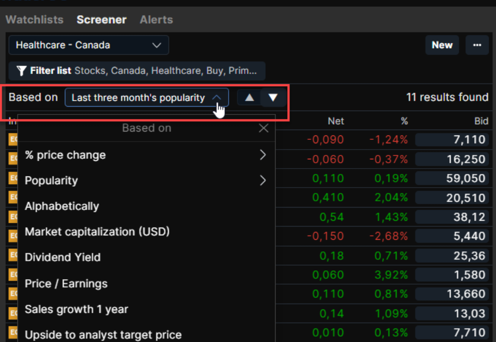 Once you have added all your filters, you can sort the results by % price change, by popularity, alphabetically and many more criteria.