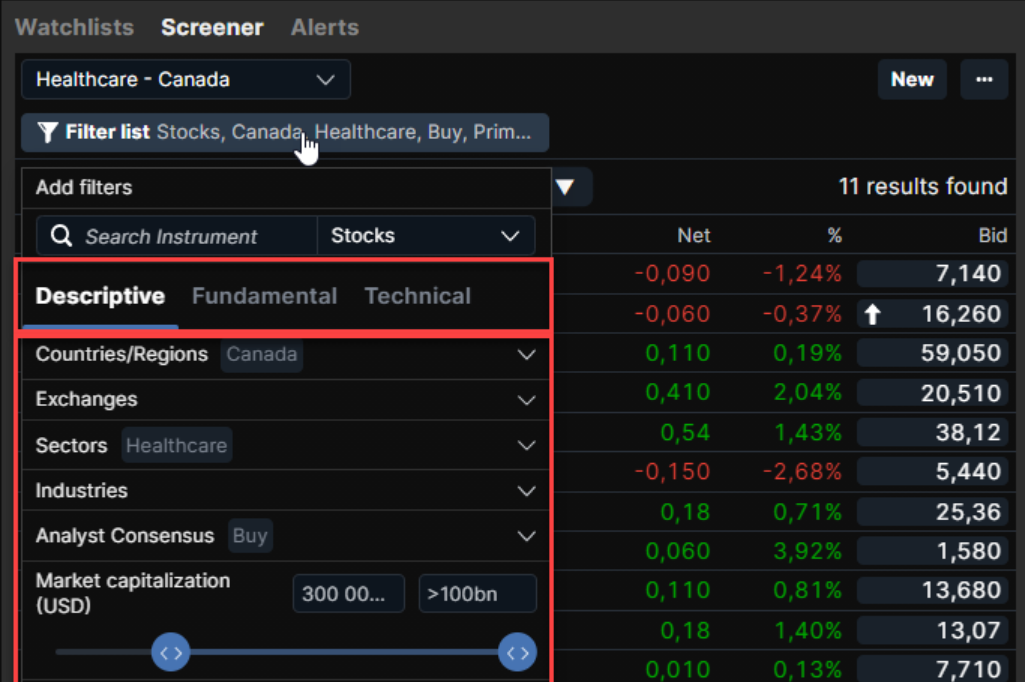 You have 3 tabs to select you screening criteria from: Descriptive, Fundamental and Technical.