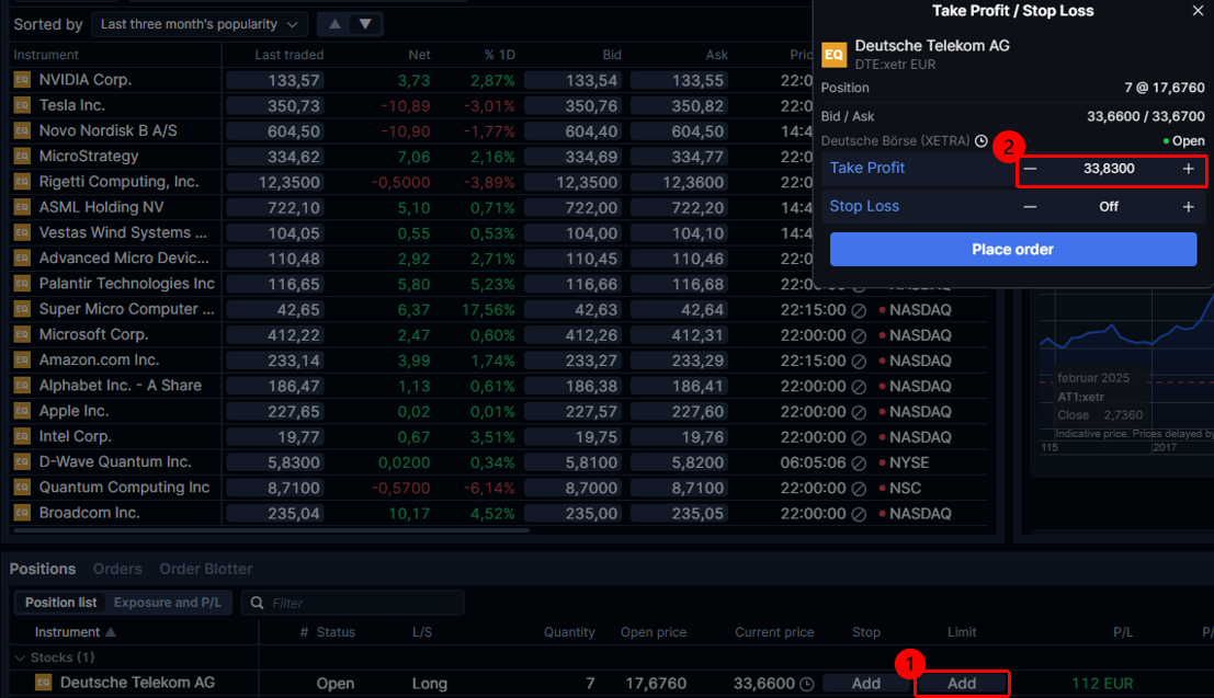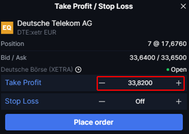 To add a take-profit order to a trade ticket, click Add Take profit / Stop loss > Click Take profit > Choose a Unit (e.g. Price) > Determine your preferred take-profit level at which you want to sell automatically. Take-profit can be added to both new and existing positions.