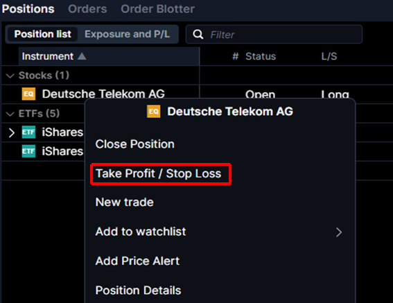 - 2. Go to the Positions module > Right-click on a position > Click Take Profit / Stop Loss > Next to "Take Profit" choose your take-profit price > Click Place Order