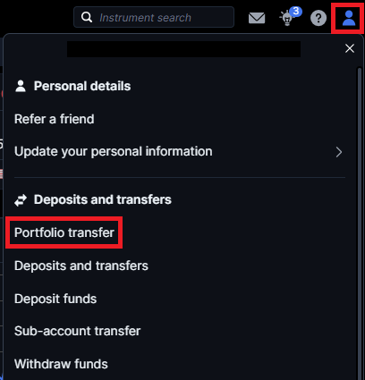 - Click the main menu > Deposits and transfers > Portfolio transfer