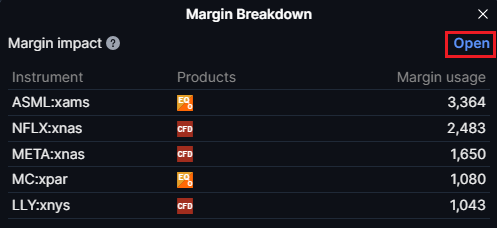 In SaxoTrader, the margin monitor keeps you informed on the impact that trading conditions changes will have on your portfolio. To learn more read Using the Margin monitor.