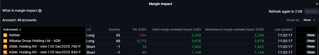 If you click Open, you can see Margin Impact which shows how closing a position will affect the initial/maintenance margin available.