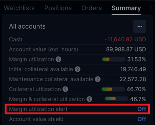 Saxo will typically send you margin alerts when your margin utilisation reaches 50%. You can add more alerts in SaxoTrader app at Trading > Summary > Margin utilisation alert