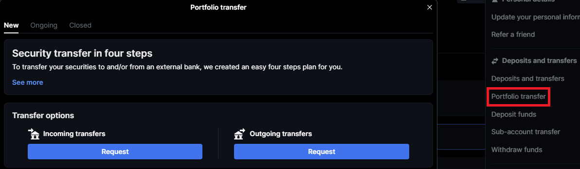 - Go to the main menu > Deposits and transfer > Portfolio transfer > New transfer