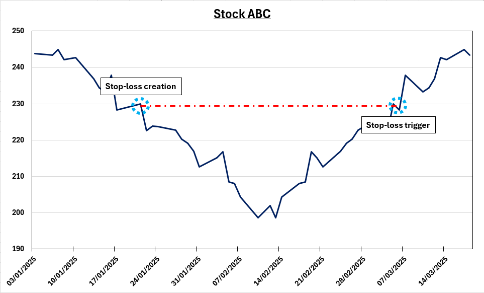 Example of a stop-loss orderSuppose you own 100 shares of a company currently trading at USD 100 per share. To protect your investment, you set a stop-loss order at USD 90. Let's assume that the stock price drops to USD 90, and your stop-loss order is triggered. Your shares are sold at the best available price, potentially minimising your losses. The market is volatile, and your shares will be sold at the next available price of USD 89.50. While this may be slightly below your stop price, it prevents further losses if the stock continues to decline. |